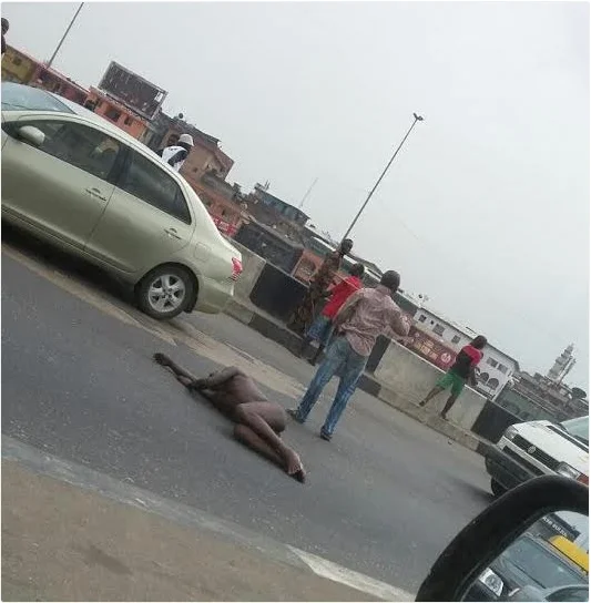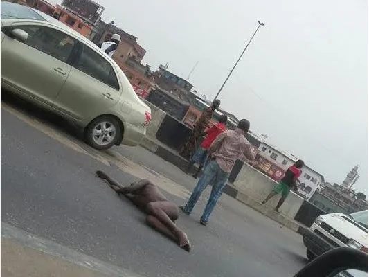 Man Lies Naked On Lagos Road, Awaits Vehicles To Crush Him [PHOTOS] Saim 06:26 Edit An unidentified man, believed to be mentally unstable, on Tuesday caused a stir on Apogbon Bridge, close to Apapa Shoals in Lagos State as he laid in the middle of the road, purportedly waiting for vehicles to crush him to death. The man stripped himself and was seen lying in the middle of the road. The development led to a massive gridlock for motorists at about 11:30am. SEE PHOTOS BELOW: Share on Facebook Share on Twitter Share on Google Plus About Saim This is a short description in the author block about the author. You edit it by entering text in the "Biographical Info" field in the user admin panel. RELATED POSTS