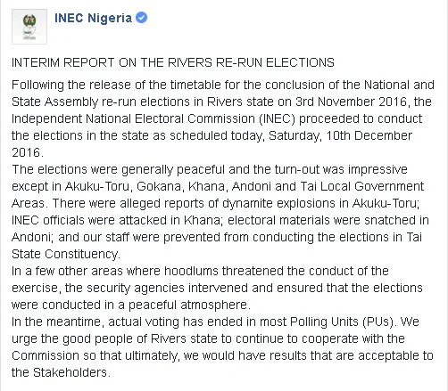 Read: “Following the release of the timetable for the conclusion of the National and State Assembly re-run elections in Rivers state on 3rd November 2016, the Independent National Electoral Commission (INEC) proceeded to conduct the elections in the state as scheduled today, Saturday, 10th December 2016. “The elections were generally peaceful and the turn-out was impressive except in Akuku-Toru, Gokana, Khana, Andoni and Tai Local Government Areas. There were alleged reports of dynamite explosions in Akuku-Toru; INEC officials were attacked in Khana; electoral materials were snatched in Andoni; and our staff were prevented from conducting the elections in Tai State Constituency. “In a few other areas where hoodlums threatened the conduct of the exercise, the security agencies intervened and ensured that the elections were conducted in a peaceful atmosphere. “In the meantime, actual voting has ended in most Polling Units (PUs). We urge the good people of Rivers state to continue to cooperate with the Commission so that ultimately, we would have results that are acceptable to the Stakeholders.