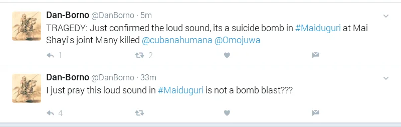 A bomb blast has reportedly rocked parts of Maiduguri, the Borno state capital few hours before midnight. Dan-Borno a freelance journalist announced the blast via Twitter. See tweets below: