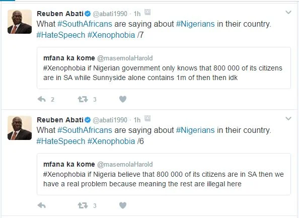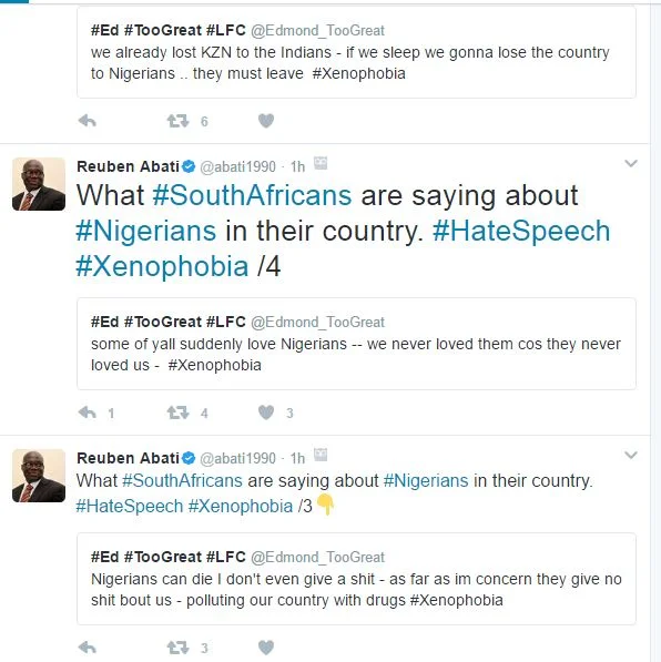 Xenophobia: What South Africans Are Saying About Nigerians Saim 11:41 Edit South African Government has assured that it will continue to collaborate with major stakeholders in Nigeria to find lasting solution to xenophobic attack of Nigerians in South Africa.The South African High Commissioner to Nigeria, Lulu Mnguni, gave the assurance on Thursday in Abuja said: “South Africa cannot stay as an island; instead, it will continue to work toward peace building and integration.”But the South Africa people are not ready to accommodate Nigerians, accusing them of drug peddling, prostitution and taking over employments in their land.Former media aide to former President Goodluck Jonathan on Friday morning took out time on social media to caption some personal grievances and hate speech South Africans are directing on Nigerians living in their home country.See tweets: Share on Facebook Share on Twitter Share on Google Plus About Saim This is a short description in the author block about the author. You edit it by entering text in the "Biographical Info" field in the user admin panel. RELATED POSTS